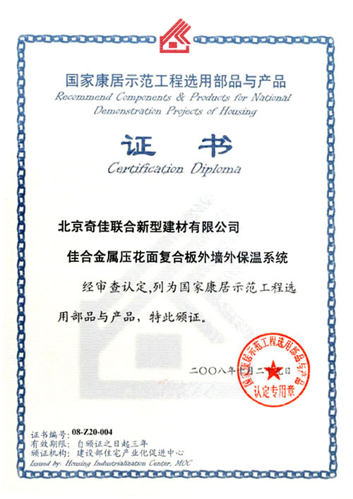 - 2008年被選入“國家康居示范工程選用部品與產品”